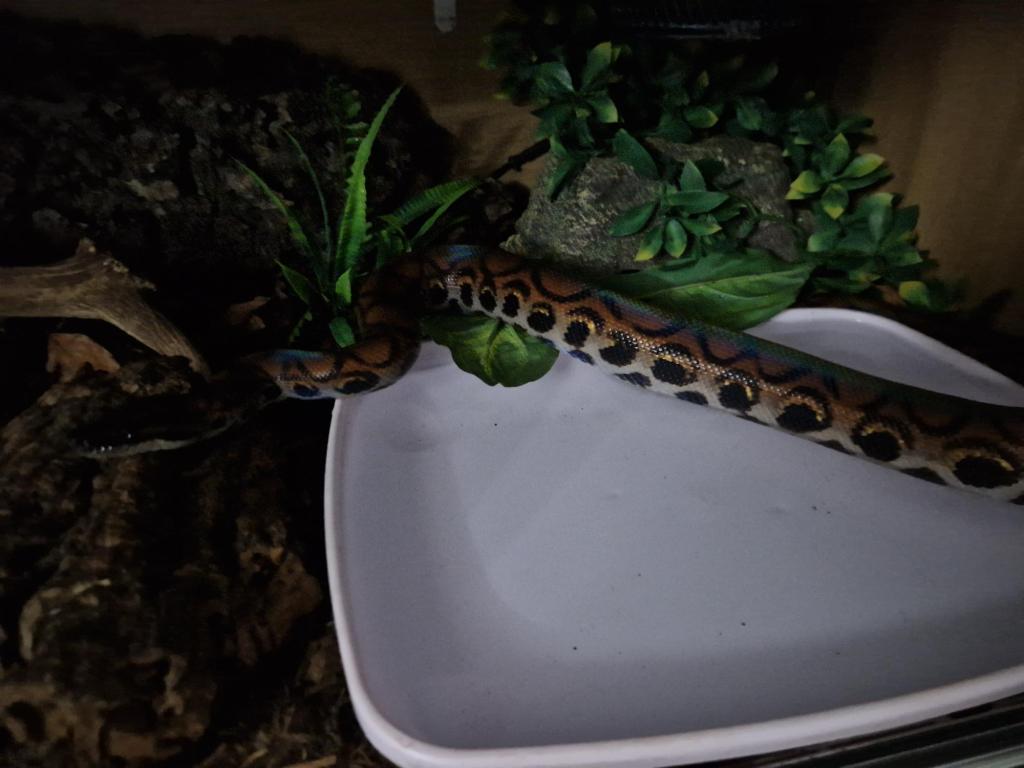 | Jafar is a male Brazilian Rainbow Boa born in 2016. Rainbow Boas are slender but strong constrictor-type snake. They have vertical pupils, a long-tapered head, blunt snout, and heat pits on the lips. Base colour is orange to red with a pattern of black rings along the back, black spots along the sides with pale crescents inside, and dark stripes on the head. The eyes are very dark, and the belly is pale. However, they are best known for their intense oil slick-like iridescence. Brazilian rainbow boas inhabit the Amazon Basin and Guiana Shield areas of South America. They prefer tropical forest habitats, where they can be found either on the ground or in the trees. As a truly nocturnal species, they do most of their hunting in the middle of the night and as such you will not often see them out and about as a pet! | |||