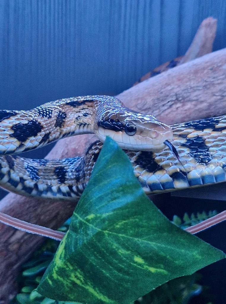 | Tarzan is a male Taiwanese Beauty snake hatched in 2021 Taiwan Beauty snakes are a species of rat snake. It has a long slender body with olive to yellowish-brown colour combinations. It has round black spots throughout its body with black stripes towards its tail The Taiwan beauty snake is a cathemeral animal. Most animals are either nocturnal (active during the night) or diurnal (active during the day). However, cathemeral animals are randomly active during the day or night. They often take small naps to gain energy instead of having a 12-hour sleep-wake cycle. They are a very shy species and as such are not ideal beginner snakes. Beauty snakes are native to various parts of Southeastern regions of Asia such as Thailand, Vietnam, Myanmar, China, but as its name suggests Taiwan beauty snakes are native to Taiwan. | |||